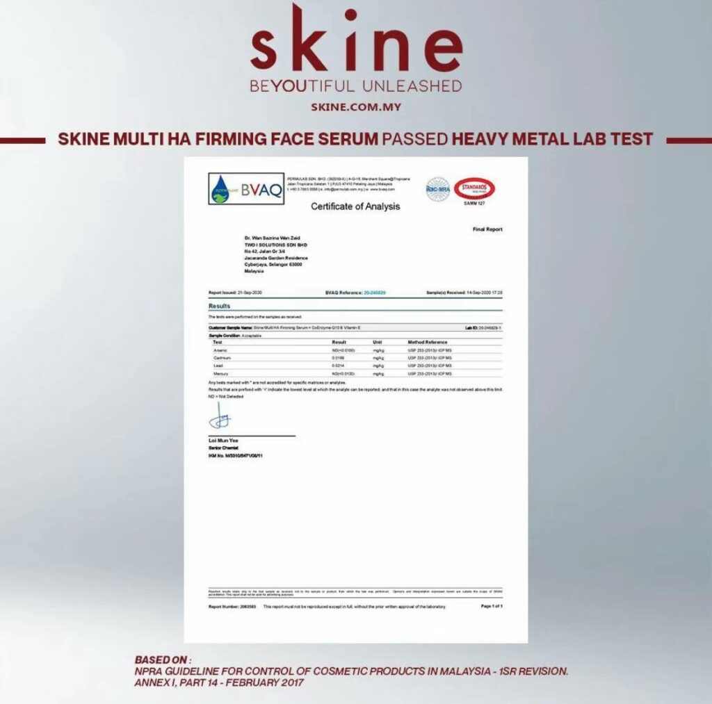 SKINE tidak mempunyai bahan terlarang yang boleh menjejaskan kesihatan kulit. SKINE diformulasikan oleh para ahli farmasi yang bertauliah dan kajian makmal.